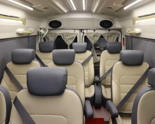 - Spacious Interior: Our luxury tempo travellers are designed with a larger space compared to standard vehicles, ensuring maximum comfort for all passengers. With ample headroom and a wide seating arrangement, there’s plenty of room for everyone to relax during the journey. Whether you’re booking a 9-seater or larger, you’ll find the spacious interior perfect for long-distance travel.